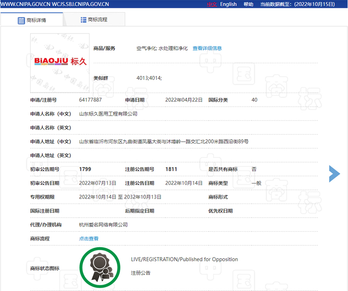 經(jīng)國家商標總局sbj.cnipa.gov.cn網(wǎng)站查詢獲悉,我公司申請注冊的標久品牌注冊商標獲得批準。